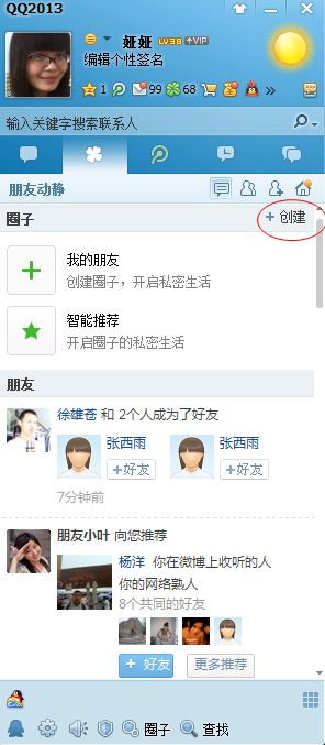 首先,登录QQ2013。然后点击QQ界面上的第二栏“朋友”,这样大家就会看到“圈子”了。这时点击“创建”,我们就可以开始创建属于自己的圈子啦!