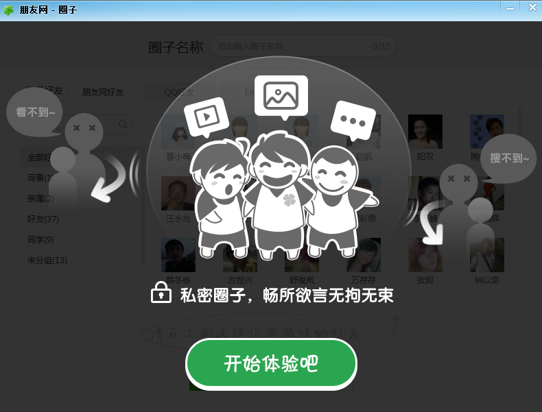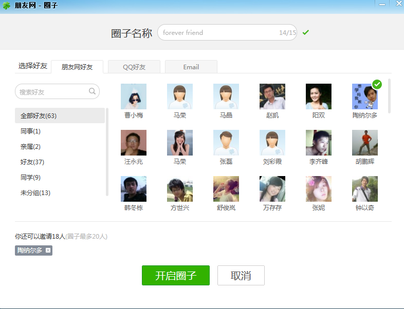 既然是一个圈子,那么也得有个特别的名称吧,大家可以随意给自己的圈子取个名字哦,小编取的是“forever friend”,因为小编准备拖入圈子的可都是死党哦!大家可以选择朋友网的朋友、QQ好友或者是Email上经常联系的人拖入自己要创建的圈子里。