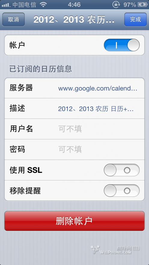 在服务器栏这里添加以下网址(显示2012、2013年农历、日历、星期的ics地址):