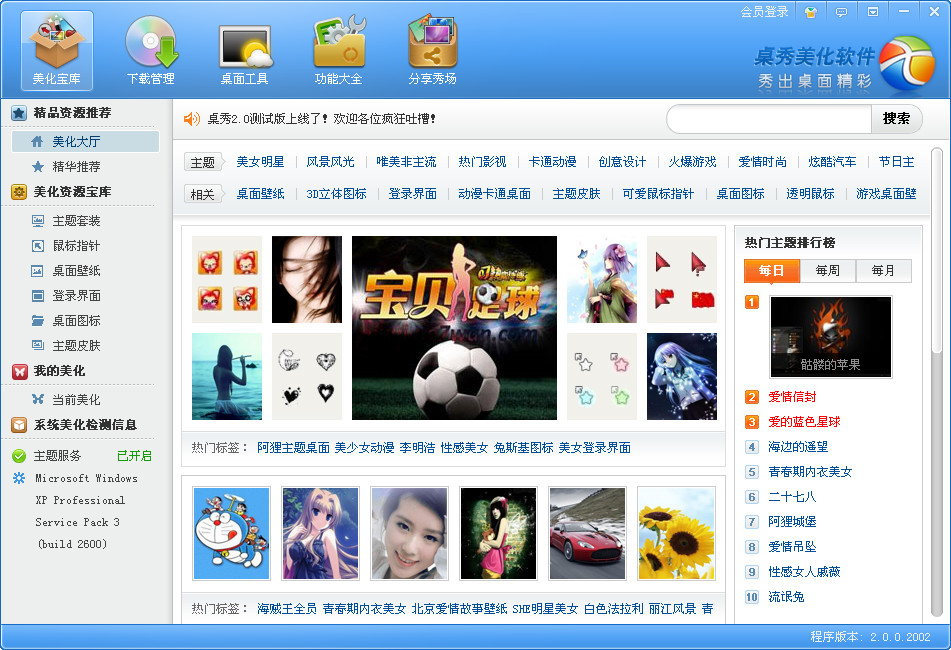 在桌秀理集成了近一万款xp电脑主题、win7主题,各种“美女明星”、“唯美非主流”、“卡通动漫”可以说是应有尽有,相信一定会有你中意的那几款哦!