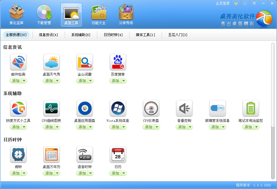 除此之外,桌秀还提供:天气预报、世界时钟、日历备忘录、便签、rss新闻阅读、仿苹果任务栏、桌面闹钟、相册等精美桌面小工具。