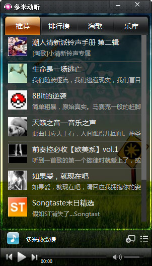 在多米动听的界面,有“推荐”、“排行榜”、“淘歌”、“乐库”这几个功能栏,首先来看看多米动听都为大家推荐了哪些好听的音乐吧!