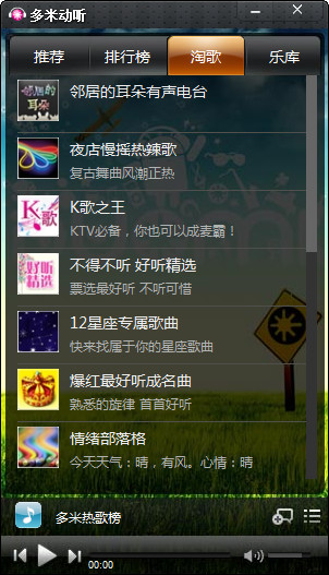 好吧,如果这些推荐的歌曲你都不喜欢的话没关系,那么就自己淘歌吧!十二星座专属歌曲,快来听听属于你的星座的歌曲吧!K歌之王,羡慕别人在KTV里的霸气十足,你也可以哦!爆红最好听成名曲,为你网罗各大当红歌星的成名作,带你一起回味曾经的那些岁月。今天心情有些低落,那么就赶紧进入情绪部落格,寻找心灵里的那个声音,相信会为你带来灵魂上的慰藉。