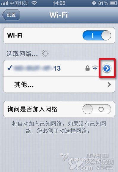步骤一、先将之前的WiFi设置抹除,然后依次点击【设置】—>【Wi-Fi】,再点击你之前使用的WiFi接入点右边的蓝色箭号。