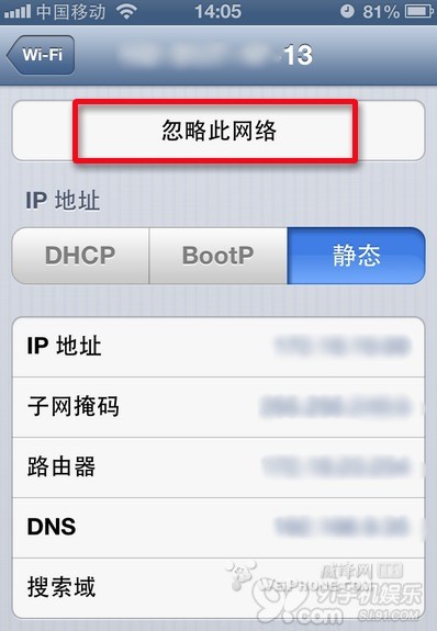 步骤二、点击【忽略此网络】,然后回到主屏幕,重启手机。