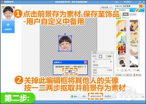 2、跳转到新界面下,点击“前景作为素材”,将抠取的头像存到“饰品—用户自定义”中,然后叉掉此编辑框,按照一二两个步骤,将照片上其他人的头像也抠好并存为素材。