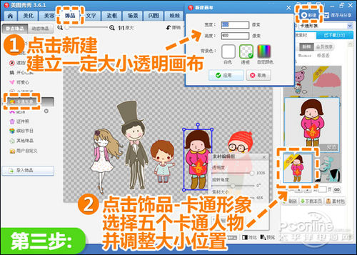 3、所有人的头像抠好后,点击“新建”建立一个透明画布,然后进入“饰品”菜单下点击“卡通形象”,按照照片中人的特点选择合适的卡通人物,调节好各素材大小位置。