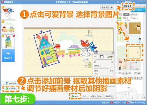 7、再点击“添加前景”,将其他插画素材抠出,然后选择一个可爱背景图片,调节各个插画素材的大小位置及角度,再加上阴影点击“确定”。