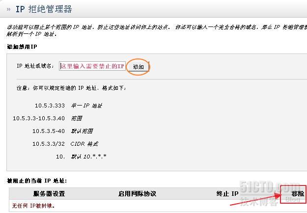 注意:输入“10.”代表的是“10.*.*.*”,在这里*是指IP地址中的正整数,因此输入“10.”将会禁止所有以“10.”开头的IP地址访问。所以当填写不完整的IP地址时,注意取舍得当,不要造成不必要的误禁。