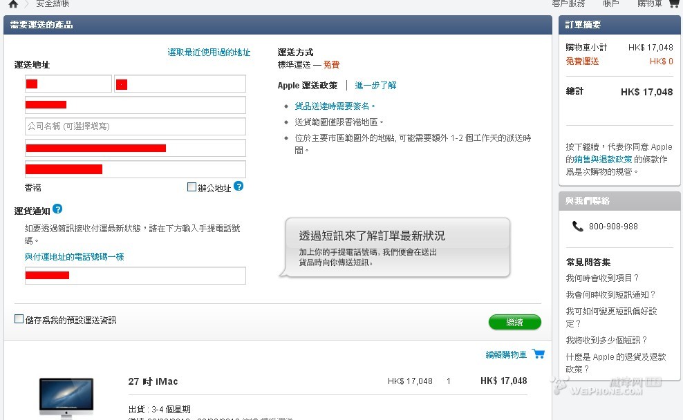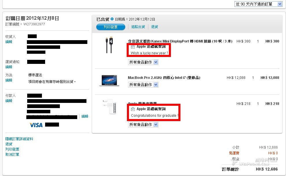 我订购那天刚好星期五晚上,我就只好等到周一工作日才收到苹果的确认电邮,中途就是由于信用卡信息填得不准,确认信息又花了两天,于是才出现图中的12号才出货的信息。