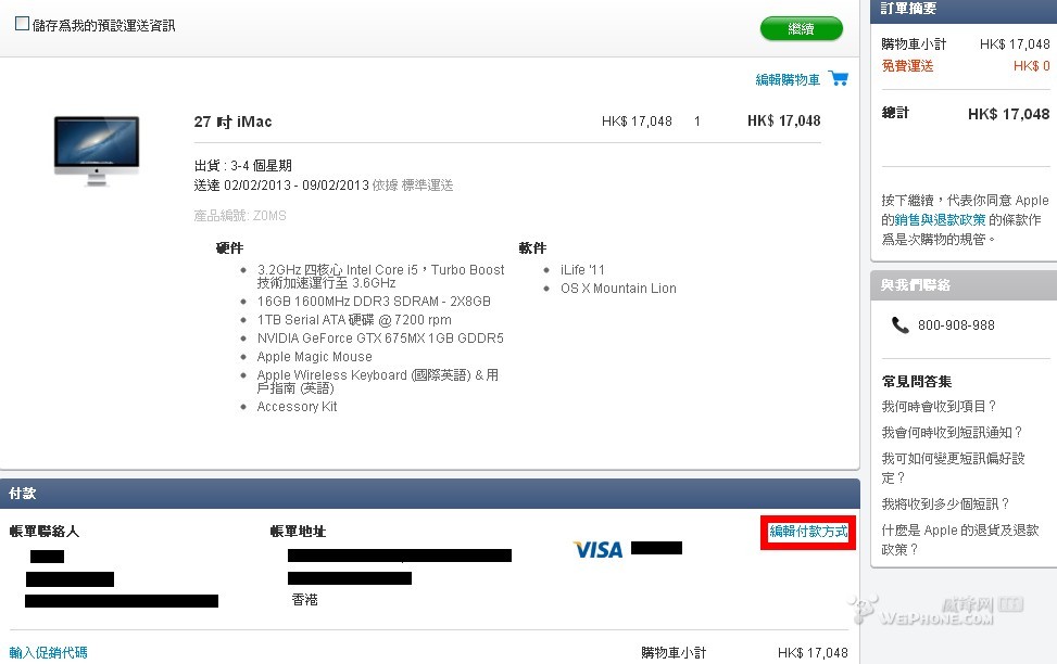 这里是针对内地客户的,所以付款人和收货人基本就不可能是同一人。我就是用我自己的卡支付,香港的朋友帮我收货,此时我们需要点击编辑付款方式,展开如下: