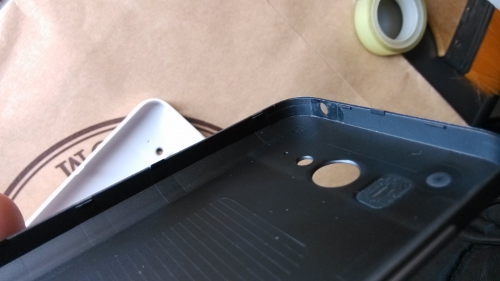 把后盖的耳机孔、数据线孔清理干净