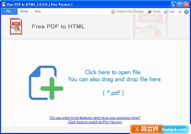 开启软件后,将要转档的PDF 文件拖曳到Free PDF to HTML 软件里,或是直接点击中央的+ 号来选择文档也可以。