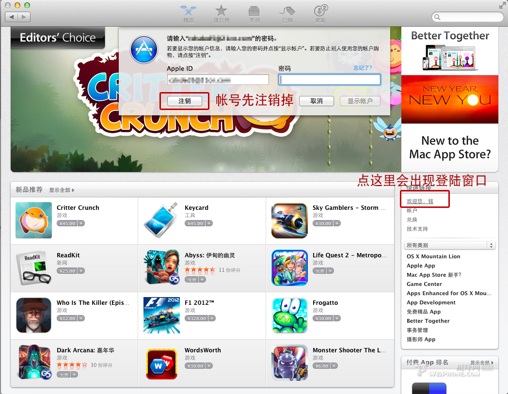 步骤1:如果之前已经有用自己的Apple ID 登陆过App store的话我们需要先进 App store,如图所示点右边下来一些的名字弹出登录窗口,在登录名的下方有个注销,点进去把帐户先注销掉,然后关掉App store。