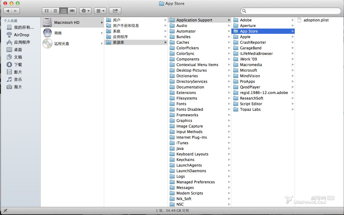 步骤2:打开Finder (在电脑的左下角)后快捷键 “shift + command + c" ,选择“ macintosh HD " 这个硬盘后选择“ 资源库 ”后继续选第一个“application support"里面有个"app store"的文件夹,里面会有个“adoption.pllst"的文件。不用怀疑,直接把这个文件删除掉。(具体路径见下图,关于有fy担心删除这个文件会不会有影响,这点不用担心,在我更新完iphoto后发现这个文件又出来了,估计这个文件只是一个保存登陆过的帐户信息而已,况且此解决办法是苹果400的技术人员提供给我的,所以删除掉不会有副作用的)