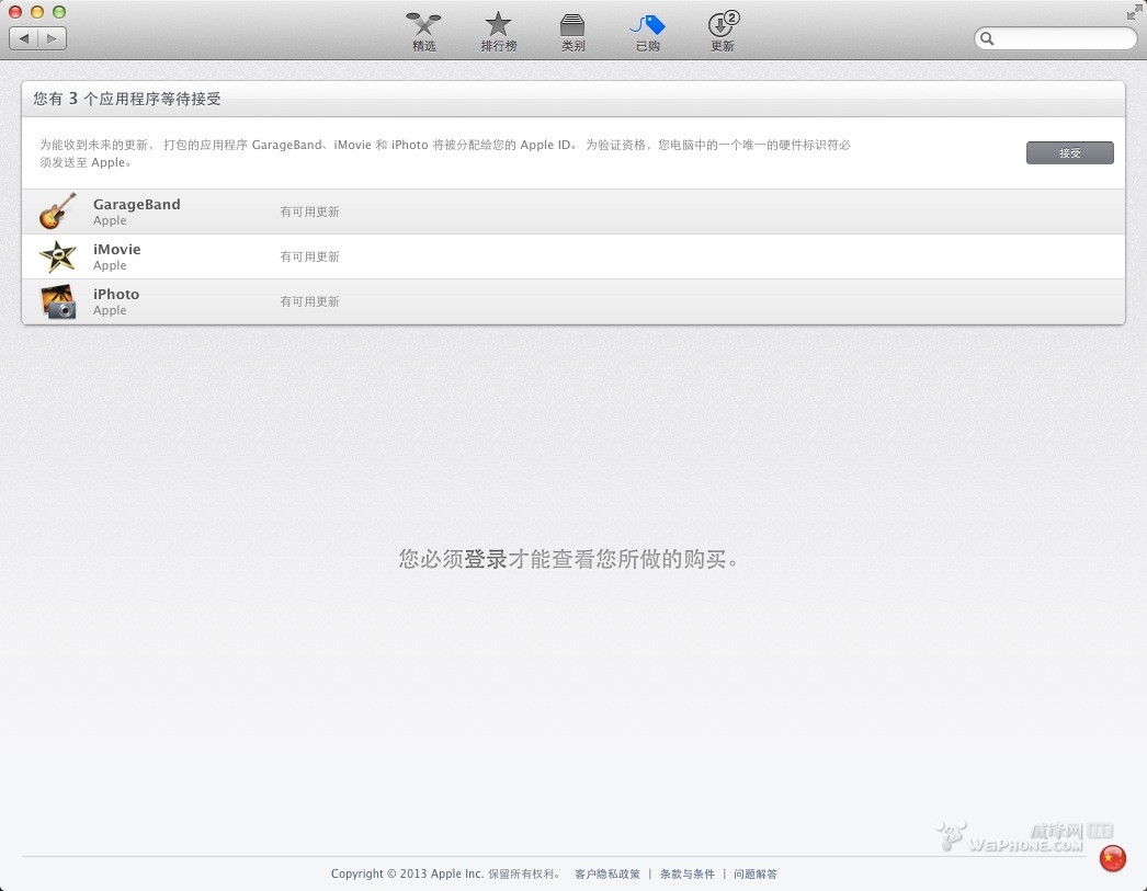 步骤3:删除“adoption.pllst"这个文件后重新进入“App store”,直接点上方有个“已购”,看下是否出现了3个软件正在等待接受,如果有的话,恭喜你!点“接受”后弹出登录窗口登陆自己的apple id,这3个软件就会加入你apple id里的已购菜单了,现在已经可以更新了,点完更新就正在下载中,等待下载完自动安装即可。