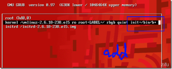 选择 kernel 这个选单,选择 “e” , 编辑,其后添加 init=/bin/bash