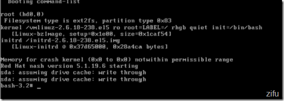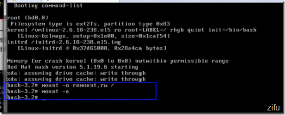 此时核心呼叫的第一支程序(init)变成了/bin/bash,此时,虽然root取得了bash来工作,但是(1)除了根目录,其他目录都未挂载,(2)根目录被挂载为只读状态,还需进行如下动作,如下图: