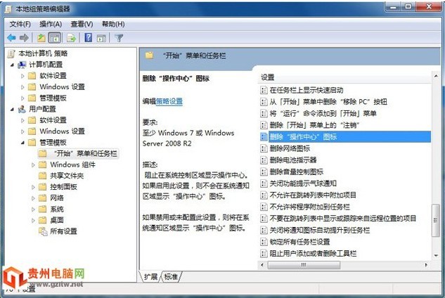 在解救该问题时,可以以此单击“开始——运行”命令,弹出系统运行对话框,输入'gpedit.msc"命令并回车,展开系统组策略编辑器界面,将鼠标定位到“用户配置”——“管理面板”——“开始和任务栏”节点上,从目标节点下找到并用鼠标双击“删除操作中心图标”组策略选项,选中其后界面中的“未配置”选项,确认后推出编辑器界面。
