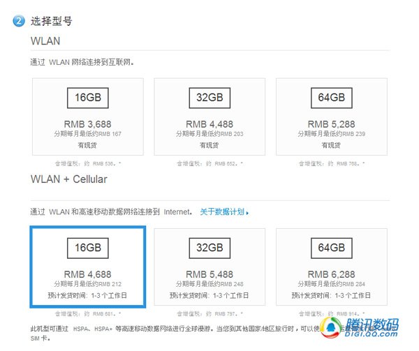 此外,苹果iPad 4 3G版(WLAN+Cellular版)也在今天正式上市,同样拥有16GB、32GB和64GB三个版本,售价分别为4688元、5488元和6288元,预计发货时间为1-3个工作日。