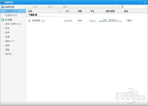 随后该引导程序将后台判断当前连接的iPhone是否越狱和是否安装91助手,如果不符合自动安装环境,引导程序会智能的为用户的iPhone设备配置安装好。完成上述配置后,引导程序即会在91助手中自动启动美图秀秀iPhone版的下载和安装工作,如下图所示。