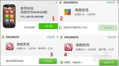 如果用户连接的是Android手机,而且该手机上也未安装有Android版美图秀秀,那么也会有对应版本的安装提示出现。然后,如果用户电脑中未安装有360手机助手,当点击立即下载后将自动转到美图秀秀安卓版官网;否则将直接启动PC电脑上的360手机助手来自动下载和安装Android版美图秀秀。流程示意如下图所示: