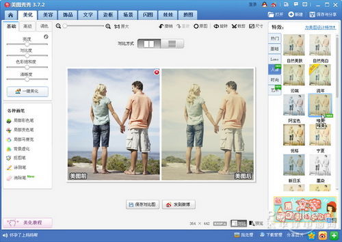 漫画特效可以用来恶搞,可是眼看新年也快到了,情侣们外出拍照如果想秀幸福肿么办呢?这时候大家就可以用“唯美”特效为两人的亲密照加点料啦,如下图所示,加过特效的照片看起来是不是显得更加甜蜜和温馨,还有点童话故事里的感觉哦!