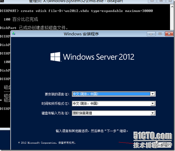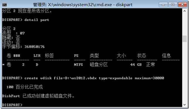 create vdisk file=d:\ws2012.vhdx type=expandable maximum=30000(前面可以看到是D盘,这里ws2012为任意起的,30000空间足够了,太大会很耗时间)