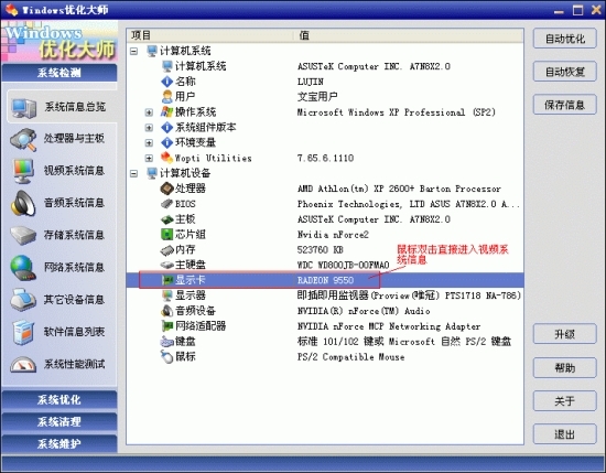 启动Windows优化大师绿色版,首先进入的是系统信息总览页面,一般我们习惯点击界面左侧的导航按钮查看详细信息,例如,点击“视频系统信息”可以查看显卡或显示器的详细信息。