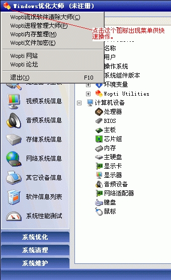技巧3、进入Windows优化大师后快速启动Wopti进程管理大师、Wopti内存整理...以及访问Wopti论坛社区等。