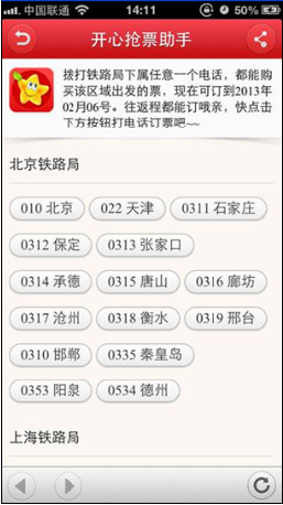比如我们要买一张从北京出发到湖南长沙的车票,在北京铁路局下属的各个地区均可订购。在购票的高峰期,拨打010—95105109订票热线有可能遭遇热线繁忙无法接通的现在,火车票随时面临被一扫而光的尴尬局面,此时可谓是分秒必争,一刻不能等待。利用开心网抢票助手,拨打北京铁路局下其他地区的电话,比如沧州0317—95105105、衡水0318—95105105等,即可顺利进入电话订票系统,帮助手机用户快速的通过电话成功订票。