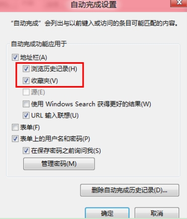 5、将“浏览历史记录” 以及“收藏夹” 前面的对号去掉,之后点确定按钮。这样地址栏的下拉菜单中就不会显示历史记录和收藏夹。