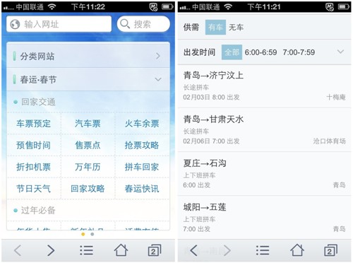 更值得一提的是“拼车回家”栏目,手机QQ浏览器与58同城合作引导用户发布拼车信息,如果没能买上回家的票,拼车回家也是不错的选择。准备自驾回家过年的朋友,也可以通过拼车节约路费,还帮助了他人。