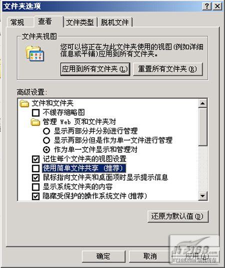 Windows XP操作系统中内置了“简单文件共享”这一功能,这项功能默认情况下是打开的,这一功能是专门为初级电脑用户而设计的。使用“简单文件共享”功能,家庭网络用户可以轻松共享文件夹。