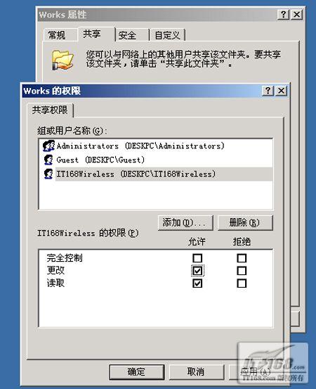 即便是超级用户,也可以设置其权限。例如,我们共享“学习资料”这个文件夹,设置为Guest用户可以读取,设置IT168Wireless用户可以更改和读取,而超级用户Administrator设置为完全控制。首先删除everyone用户组,再一一设置每个用户的具体权限。
