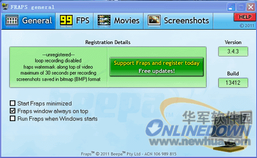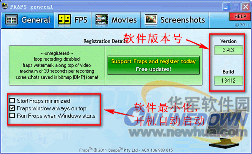 Fraps在完成安装后,双击桌面图标即可启动软件,在软件的主界面上我们可以看到软件的版本信息以及软件的一些启动方式设置选项,用户可根据自己的需要对软件进行相关设置,如下图所示: