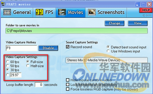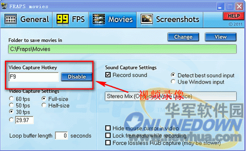 用户如要使用该软件进行游戏视频录像的话,可点击软件上侧的Movies按钮在此功能选项中我们可以看到软件的录像功能,软件开启录像热键为F9,软件默认视频保存路径为C盘FRAPS/MOVIES,用户也可以点击上侧的CHANGE按钮来改变相关路径,如下图所示: