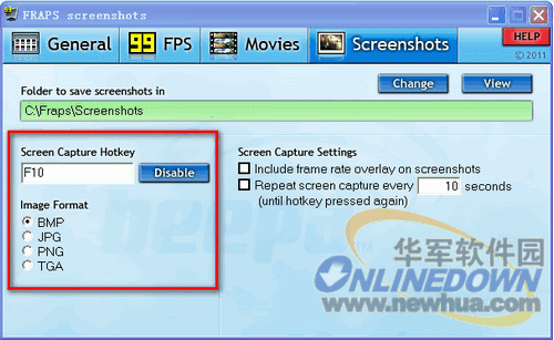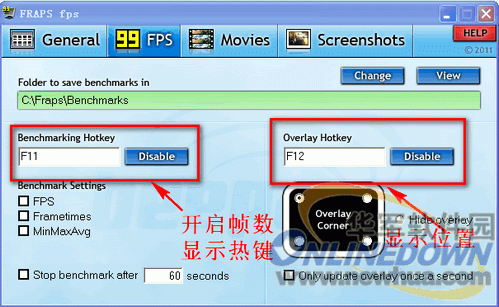 Fraps其实主要功能是显卡辅助软件,它可以在大家在进行游戏时显示的帧数从而让大家了解及其的显卡性能,在FPS选项中大家可以看到相关的操作按钮,F11是开启显示帧数的热键按钮,F12是开始显示位置的热键,如下图所示: