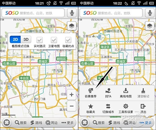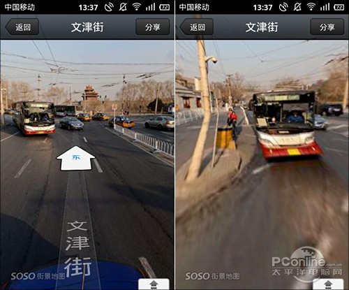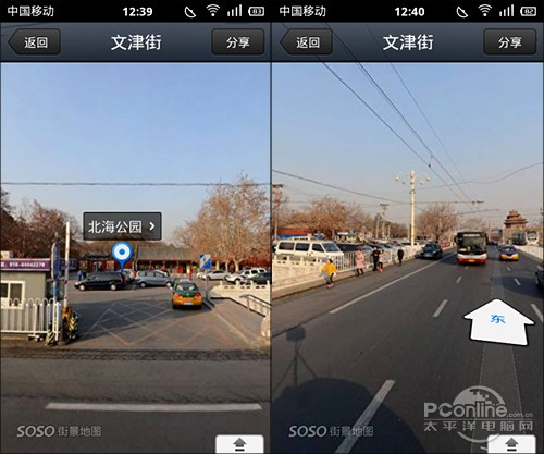 和WEB版一样,手机版SOSO街景也会在街道上标出方向箭头,而且点击也能向目标方向定向移动,这种设计几乎可以保证在北京这种横平竖直的城市里不会轻易迷失方向。而前进过程也和Google一模一样,中间会有一个酷酷的变形动画进行衔接,至少不会让你走得很迷茫。