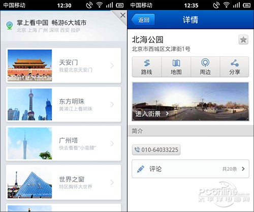 查找到的景点会在图中明显标识,无论你身在何处,只要照着提示走过去就成。不过相比WEB版,手机版并没有给出当前位置到底离目标还有多远,同时也没有相邻地点提示。而且还有一个很明显的问题是,默认情况下它只能显示你所搜索的那个位置,如果再想转到其他地点,是没办法在街景中直接查找的。一个办法是点击右下角箭头切换到普通地图模式,再一个就是人人都知道的笨法了,一步一步走过去吧。