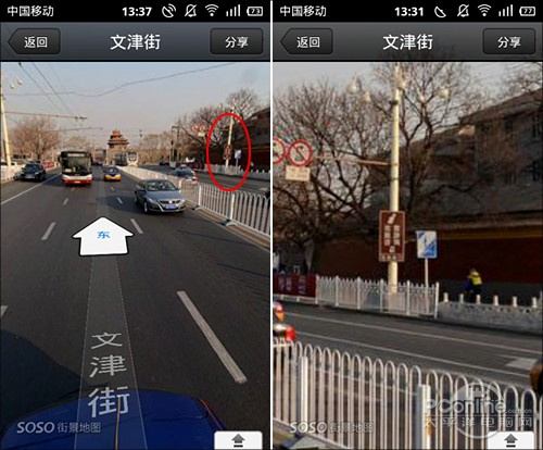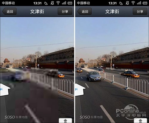 和传统地图一样,街景视图支持双击快速缩放,双指定向缩放,整个过程非常流畅。如果带宽给力的话,画面由模糊变清晰的时间是很短的。而且貌似SOSO街景设置了两级分辨率,当放大到一定程度时,服务器会自动给出更高分辨率的画面,一些标准视图无法看清的内容在这一级中可以轻松看到。虽然仍然无法达到看清文字的目的,但效果真的挺赞的!