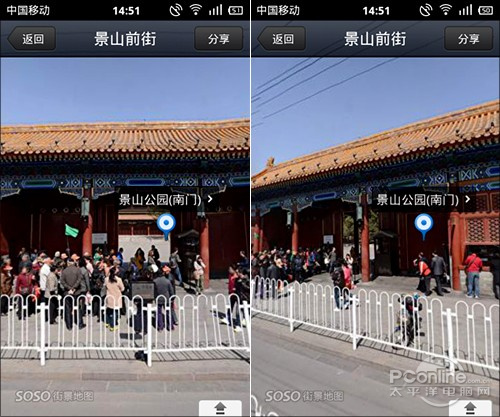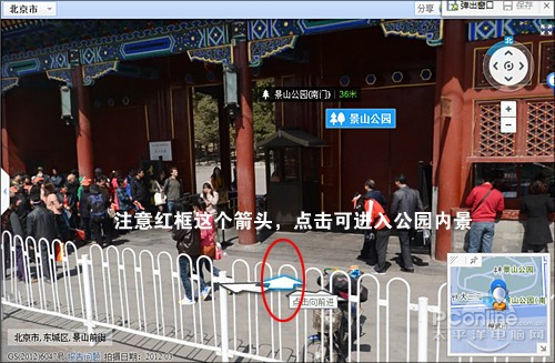 不得不说,SOSO地图的街景真的就是“街景”,哪怕旁边是一个名气很大的公园(比如景山公园),你也没法点击进入。当然咱得承认这里有拍摄车能否进入的问题,但我想更多的还是人力因素吧。