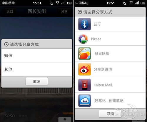 找到好玩的地儿,哪能不和死党们分享。好吧,右上角的”分享“按钮就是干这个用的。当然对于手机来说,短信是最直观的一种方式,此外社交网络也没问题。Android版的支持已经很好了,基本上你手机里安装的社交软件都能使用。不过听说……iOS版的设计比较坑爹,支持的全部是腾讯自家的东东(如微信、腾讯微博等),不过俺手中暂无水果产品,所以还是请各位高富帅们自己来“辟谣”吧。