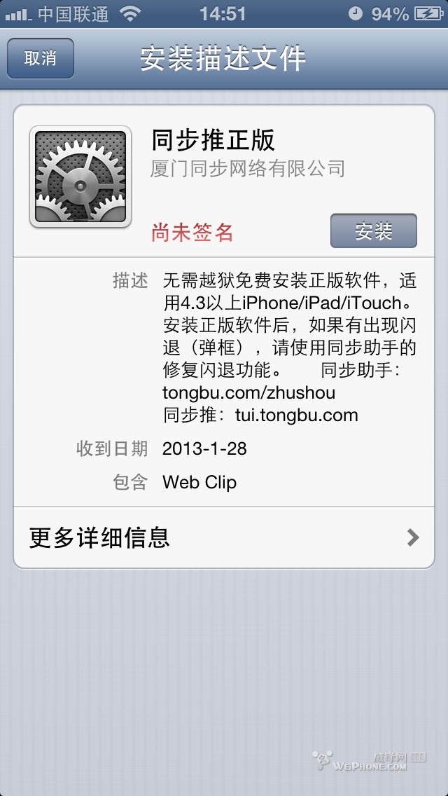 这时候会发现手机会自动跳到“安装描述文件”这一步,如下图: