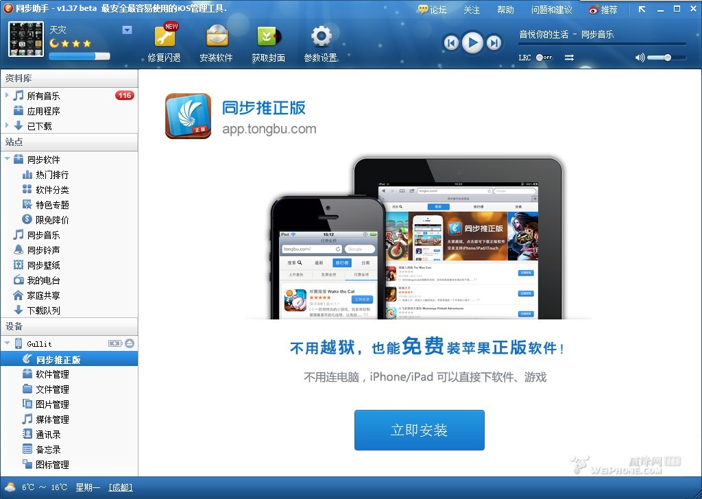 相信大部分人都是通过电脑上的“快用苹果助手、PP助手、91”这类电脑端的助手再为IPHONE5安装不越狱的正版完整免费应用。其实大家可以直接从IPHONE5手机端来安装这类正版免费完整应用哦,下面小编就来告诉大家用同步推安装ITUNES里收费的完整应用程序的。
