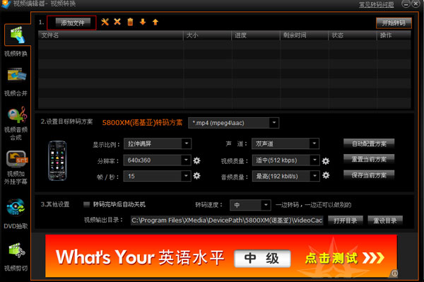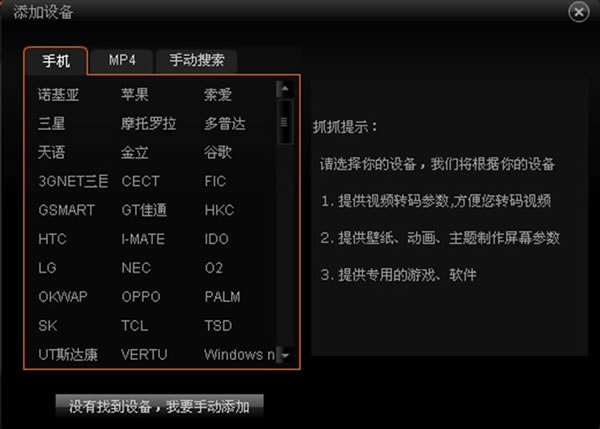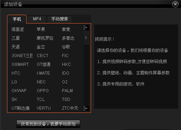 当你安装完软件后,首先请选择你的手机型号,选择完毕后,你不需要像其它转码器一样去设置什么参数,软件会根据你的手机自动设置好的:如图