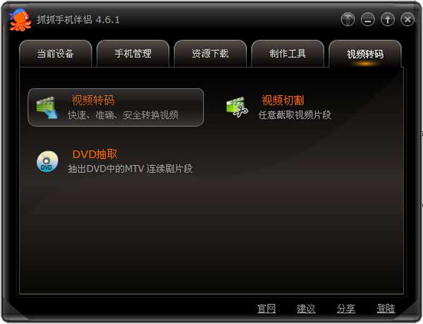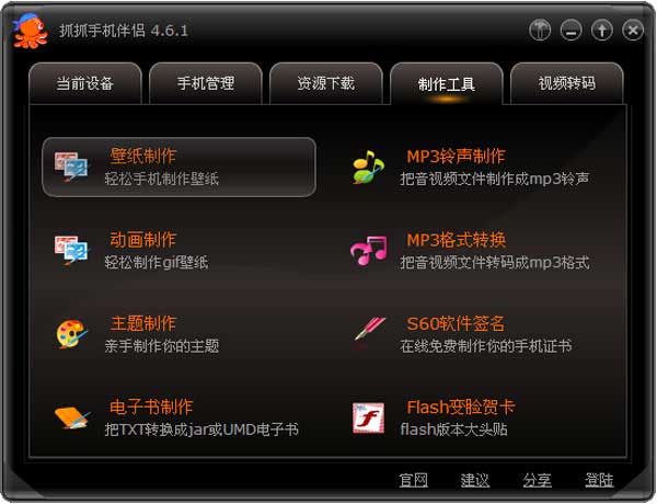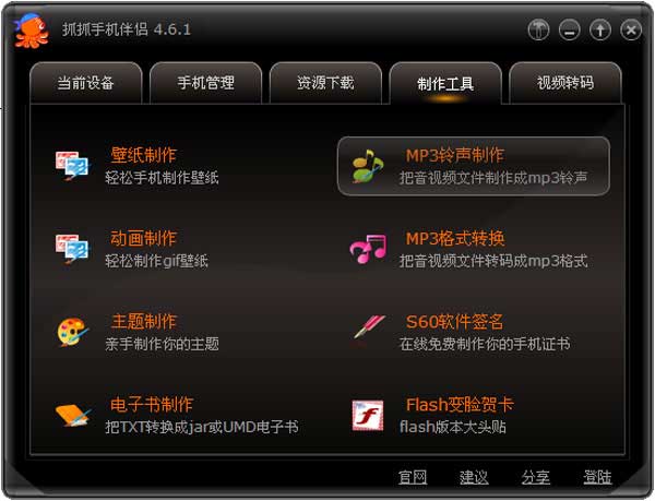 抓抓手机伴侣是一款为手机、MP4提供智能管理、资源下载、多媒体制作的PC软件。当然这款软件的功能可远不止这些哦!今天小编就教大家如何使用抓抓手机伴侣进行视频转码、制作铃声、壁纸、电子书,下面一起来学习下吧!