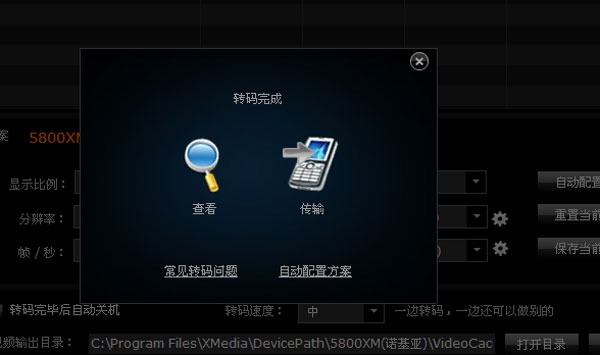 转码完毕后会,你可以查看文件,传输文件到你的手机(数据线连接电脑),如果遇到视频在手机里不能观看,你可以查看常见问题解决方案,你可以点击“自动配置方案”从新调整参数!