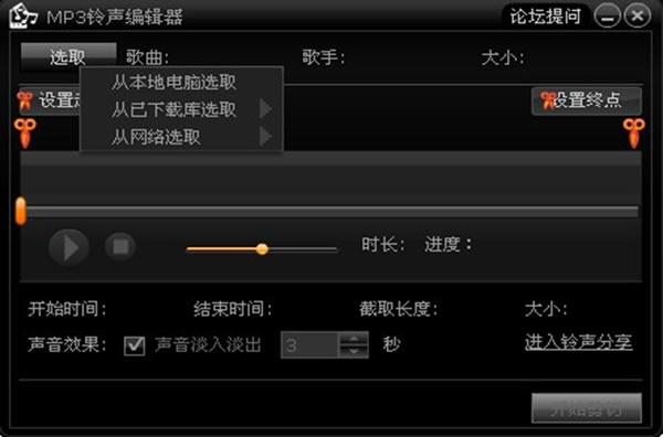 进入到铃声编辑器操作界面后,点击“选取工具”后出现三种选取方式,可以从本地电脑、已下载库(这里可以选择从音乐铃声库和视频下载库中下载,而视频下载库是指可以选择视频文件进行抽取MP3)和从网络选取(可以搜索下载MP3)