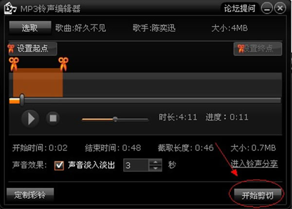 Mp3文件载入完成后可以设置起点、终点截取自己喜欢的段落(一般选择高潮部分),可以反复试听,还可以调节下面的声音效果和音量,(声音过大会产生爆音、失真。同时也影响手机扬声器的使用寿命)选好歌曲段落后点击右下角的“开始剪切”